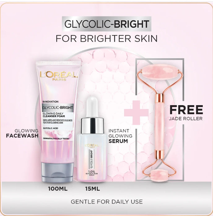 Bundle - L'Oreal Paris Glycolic Bright Instant Glowing Face Serum 15Ml + L'Oreal Paris Glycolic Bright Glowing Daily Face Wash 100ml with Free jade Roller