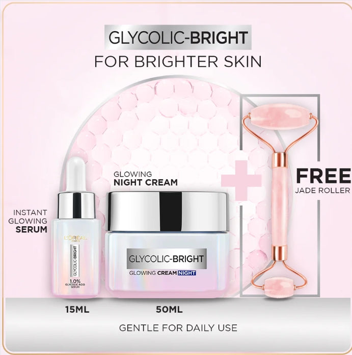 Bundle - L'Oreal Paris Glycolic Bright Instant Glowing Face Serum 15Ml + L'Oreal Paris Glycolic Bright Glowing Gel Night Cream 50ml with Free jade Roller