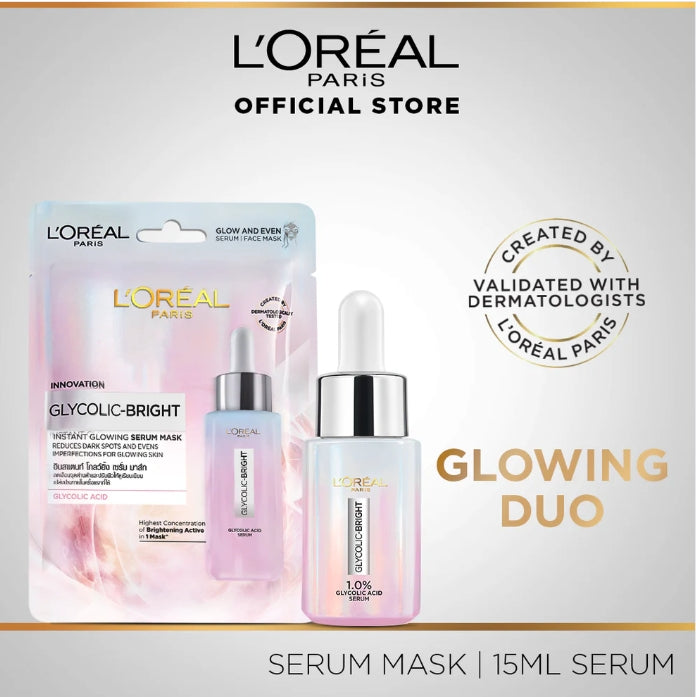 Bundle - L'Oreal Paris Glycolic Bright Instant Glowing Face Serum 15Ml + L'Oreal Paris Glycolic Bright Instant Glowing Serum Mask