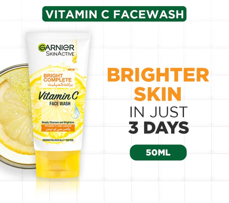 CLEANSE, REMOVE IMPURITIES, AND BRIGHTEN your skin with the Garnier Bright Complete Vitamin C Facewash.