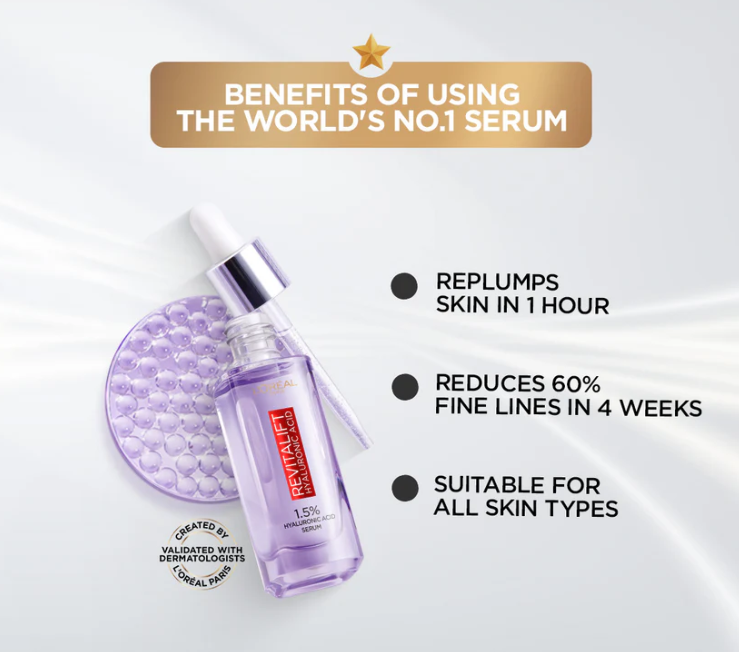 For best results, use face serum day and night, together with derm validated LOréal Paris Revitalift 1.5% Hyaluronic Acid cream.