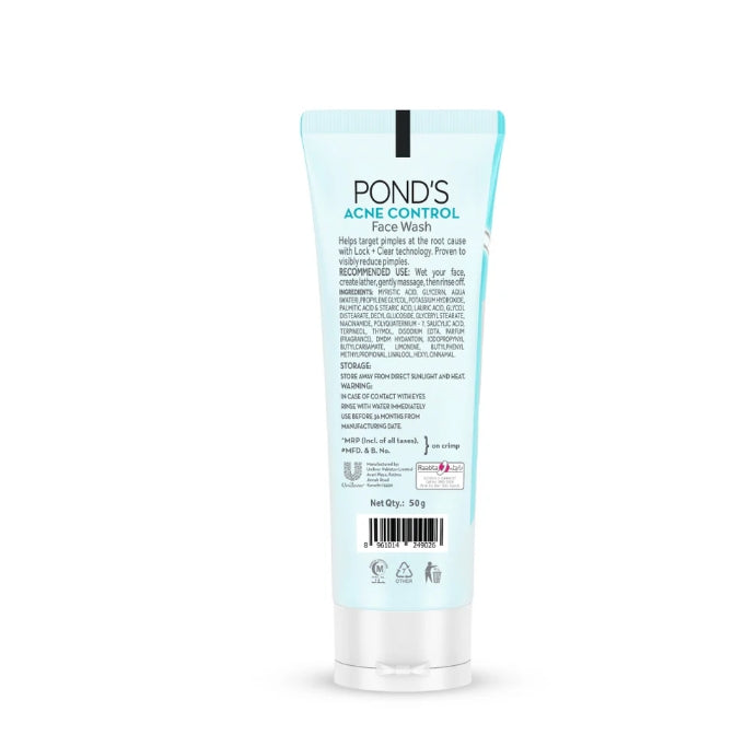 | What It Is: POND’S Acne Control Facewash helps target pimples at the root cause with Lock + Clear technology. It helps regulate sebum production that eliminates oiliness for a blemish and acne-free skin. Skin Type: Oily & Acne Prone About the Product: • Reduces 99.9% pimple causing bacteria in 10 seconds • Active Thymo-T Essence Formula targets pimples at the root • Helps target pimples at the root cause with Lock + Clear technology • Clinically proven to deep cleanse pores and control oil • Clinically proven to reduces blackheads Instructions for use: Wet your face, create lather, gently massage onto face and neck, then rinse off. |